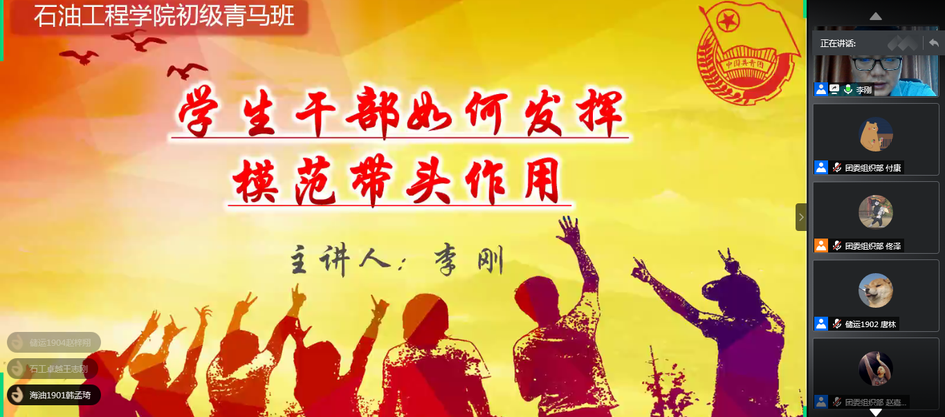 為進(jìn)一步提升學(xué)生干部的工作能力,強(qiáng)化班級(jí)建設(shè),522日下午石油工程學(xué)院第八期初級(jí)青馬班第三講順利開展。我院2019級(jí)輔導(dǎo)員李剛老師為全體參訓(xùn)學(xué)員作了題為“學(xué)生干部如何發(fā)揮模范帶頭作用”的線上培訓(xùn),2019級(jí)全體學(xué)生干部參加了此次培訓(xùn)活動(dòng)。