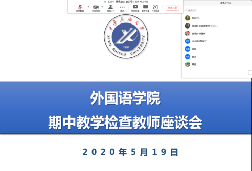 為迎接學校期中教學檢查,外國語學院于2020年5月19日下午通過騰訊會議平臺舉行了期中教學檢查線上教師座談會。外國語學院教學副院長陳武主持召開了此次會議,校督導組組長郝華寧,校督導張倩霞、朱銀泉、劉紹東、王新建以及外國語學院各系部主任和教師代表、教學辦相關人員參加了此次座談會。