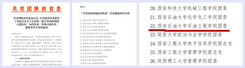 近日,共青團(tuán)陜西省委、中共陜西省委教育工委聯(lián)合下發(fā)《關(guān)于公布第一批全省高校團(tuán)建示范院校、標(biāo)桿院系、樣板支部培育創(chuàng)建單位名單的通知》,石油工程學(xué)院團(tuán)委入選第一批“全省高校團(tuán)建標(biāo)桿院系”培育創(chuàng)建單位。