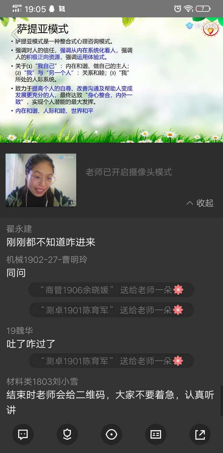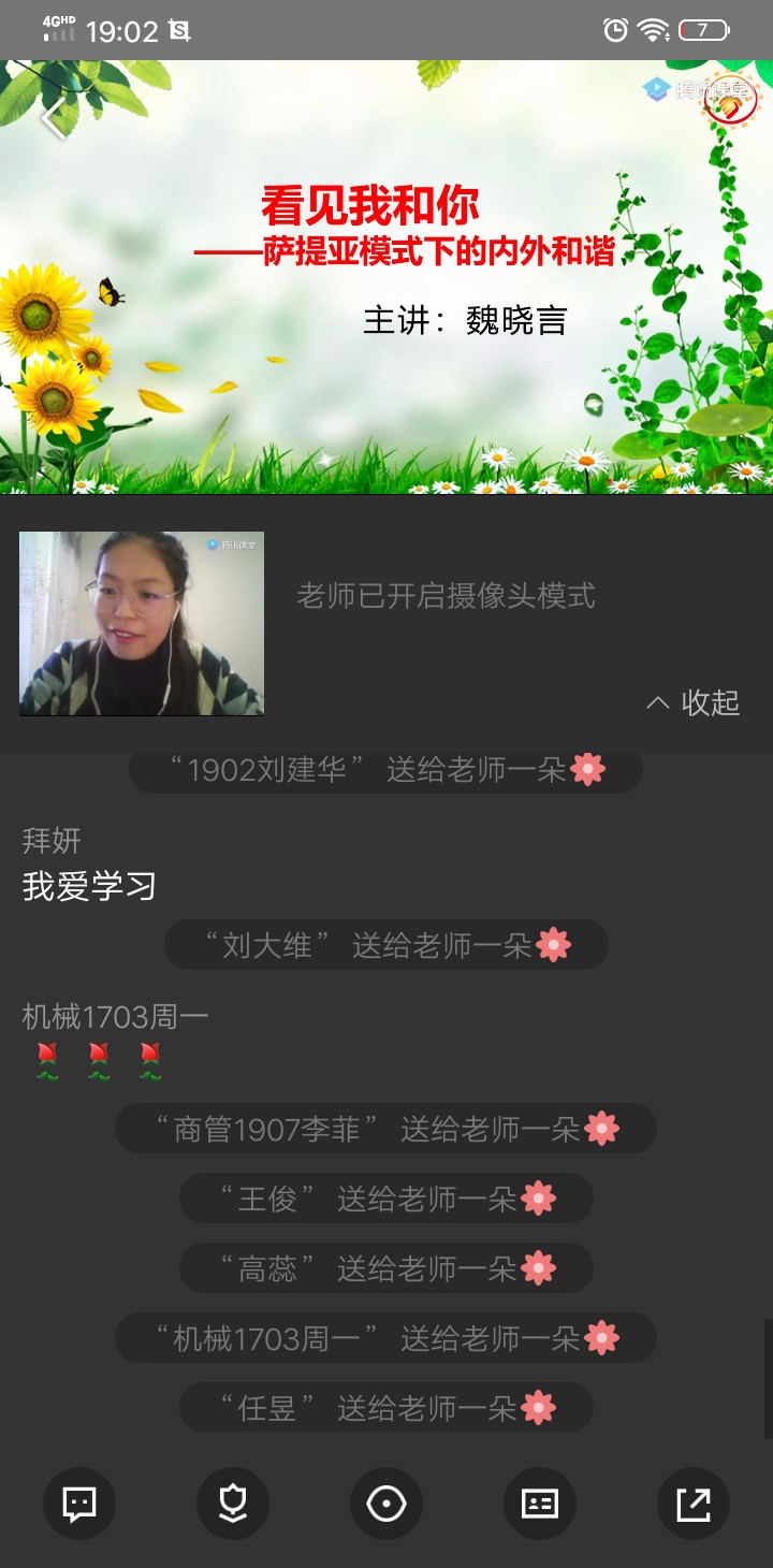 講座結(jié)束時,魏老師說要讓所學的知識成為自己的,需要去運用、練習和分享,并邀請同學們分享在這一個小時的學習里,你的收獲和感悟是什么?同學們紛紛表示通過學習學會了如何提高自我覺察,如何學會接納自我,在家如何與父母溝通及溝通的技巧等,最終達到內(nèi)外的一致和諧。