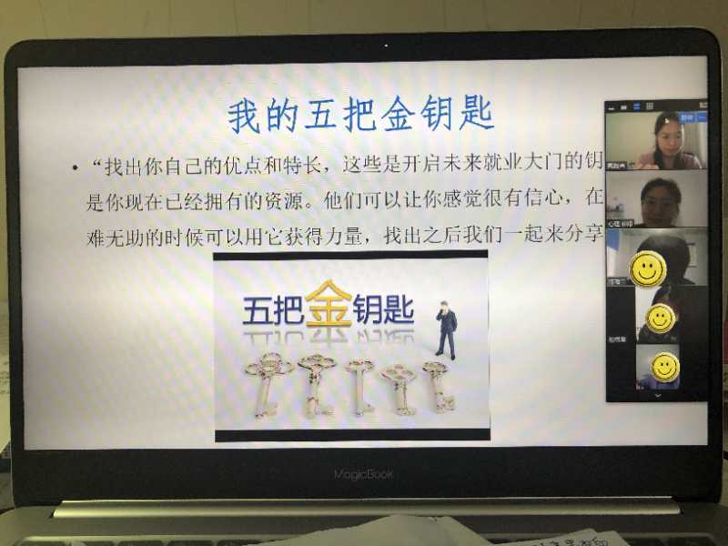 結(jié)合當(dāng)前疫情特殊情況,為做好此次線上團(tuán)體輔導(dǎo)方案,焦文潔老師公開招募畢業(yè)生,逐一了解報名學(xué)生的問題及困擾,最大程度貼近學(xué)生,走進(jìn)學(xué)生,結(jié)合學(xué)生的問題和困擾設(shè)計(jì)活動方案、修訂活動計(jì)劃,在特殊時期面向畢業(yè)生開展的第一次網(wǎng)絡(luò)團(tuán)體輔導(dǎo)。團(tuán)體輔導(dǎo)中,焦文潔老師以“自我介紹”和“十巧操”為開場,通過“大家猜猜看”、“我的家族樹”、“會心漫談 解憂雜貨鋪”、“我的五把金鑰匙”和“自我調(diào)適”五個活動,以體驗(yàn)和互動分享的形式,緩解畢業(yè)生自身的壓力和不良情緒,同時幫助畢業(yè)生進(jìn)一步了解自己的優(yōu)點(diǎn)和潛能,學(xué)習(xí)自我欣賞,自我肯定,更好地進(jìn)行生涯探索和規(guī)劃。同學(xué)們表示,通過本次團(tuán)體活,緩解了目前面臨的就業(yè)心理困擾及擔(dān)憂,今后將繼續(xù)合理安排自己的學(xué)習(xí)、生活,學(xué)會在疫情中規(guī)劃與積淀,面對與調(diào)整,為開學(xué)后找工作做好心理準(zhǔn)備。