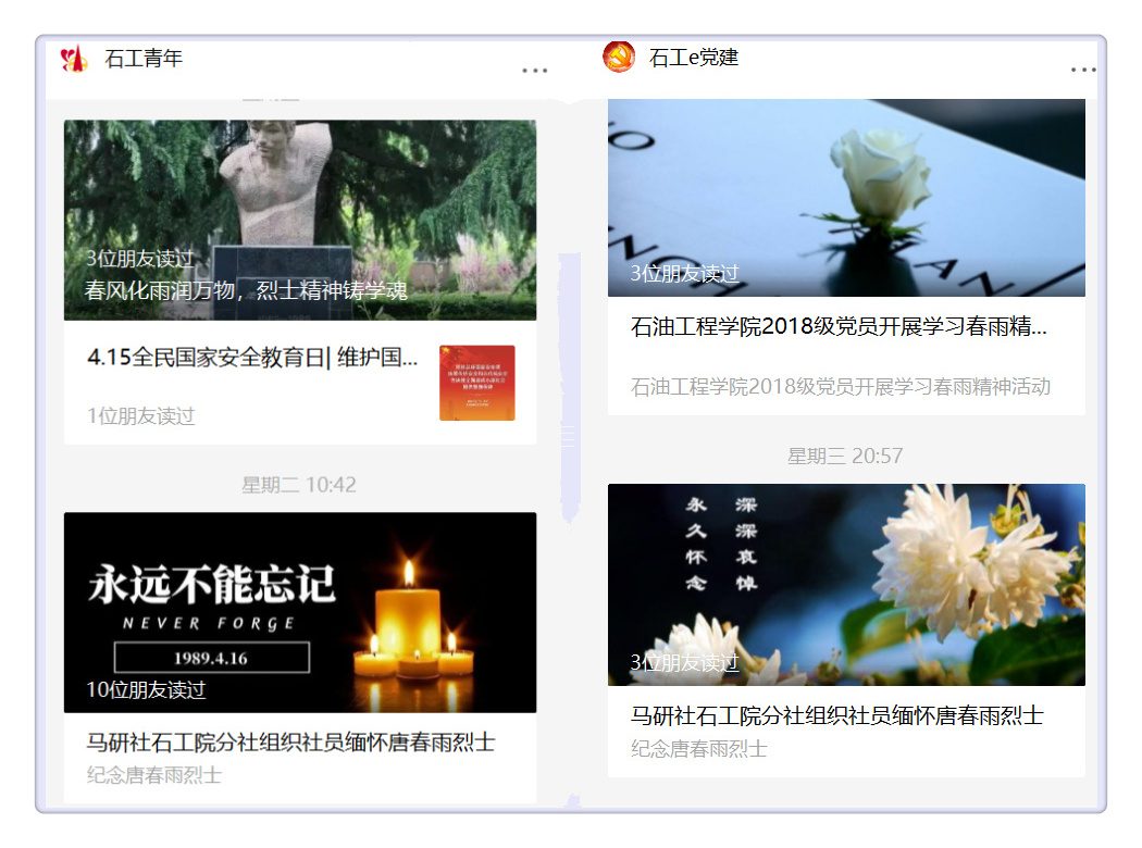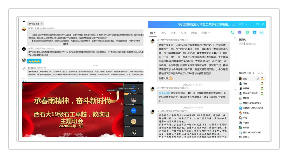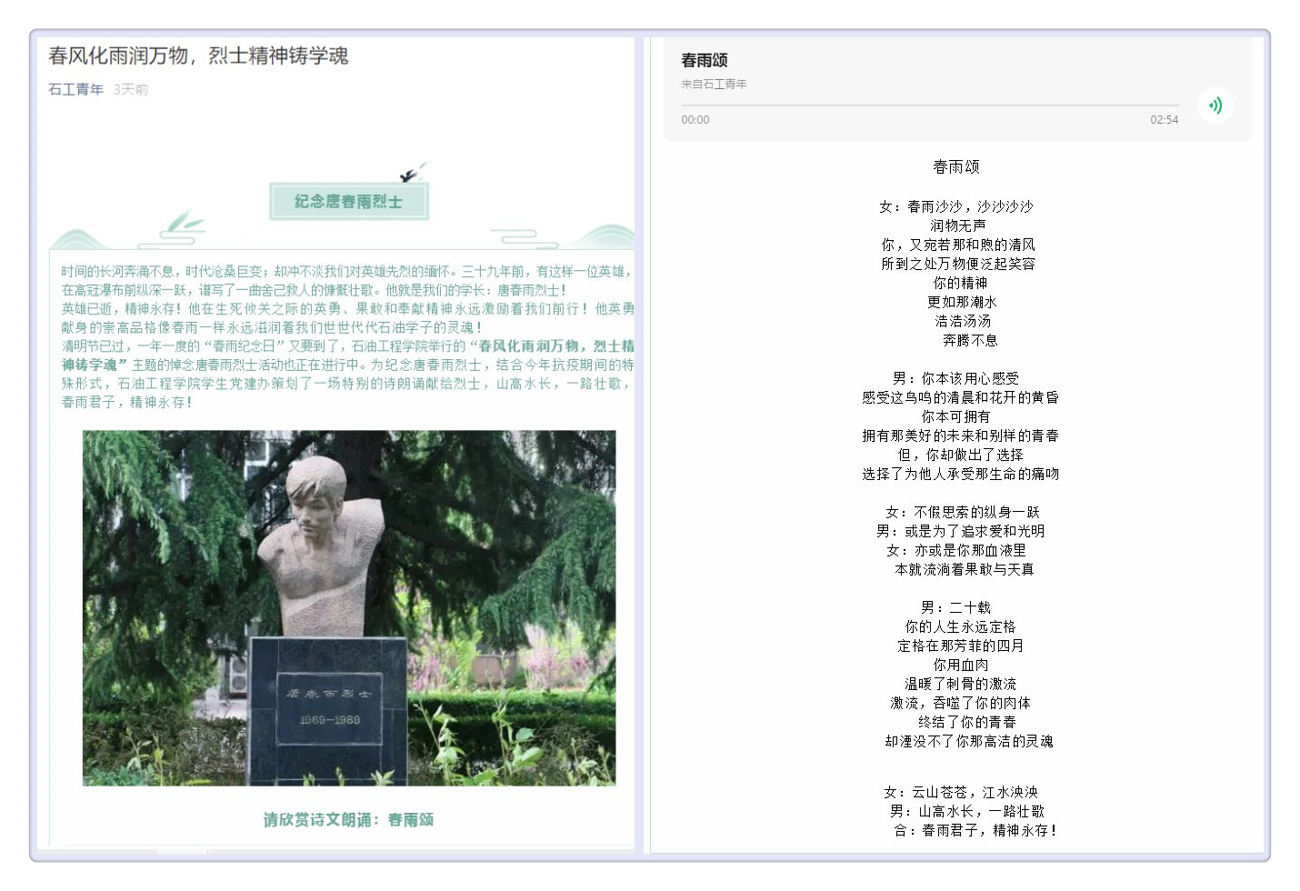 正直疫情防控期間,學(xué)生們無法來到現(xiàn)場緬懷烈士。為表示對唐春雨同志的追思,鼓勵更多青年學(xué)生了解和學(xué)習(xí)傳承“春雨精神”,學(xué)院于4月初開始,開展了線上系列紀(jì)念活動。各學(xué)生黨支部積極開展以學(xué)習(xí)“春雨精神”為主題的“三會一課”活動;馬克思主義研習(xí)社石油工程學(xué)院分社就緬懷唐春雨烈士、學(xué)習(xí)“春雨精神”舉辦了線上專題研討會;各團支部也分別召開了學(xué)習(xí)唐春雨烈士事跡和“春雨精神”的主題團會;2018級和2019級本科生還聯(lián)合制作了配樂詩朗誦《春雨頌》紀(jì)念烈士。同時,石油工程學(xué)院還積極向全體學(xué)生征集學(xué)習(xí)“春雨精神”感悟的文章,并利用石工青年等媒體平臺積極宣傳分享,諸多線上活動取得良好成效。