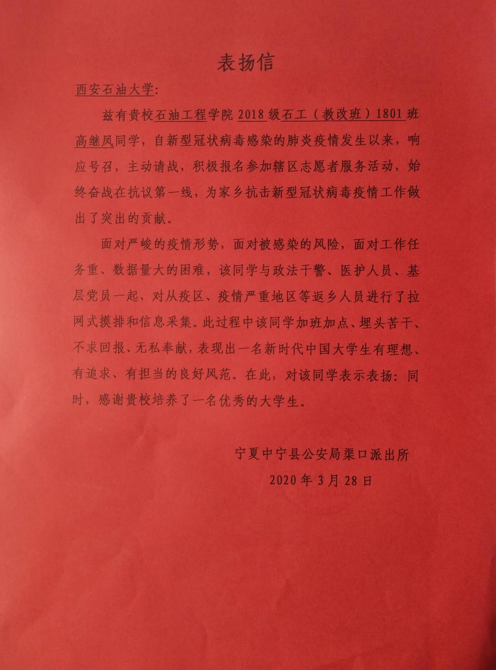 新冠肺炎疫情發(fā)生以來(lái),石油工程學(xué)院青年學(xué)子勇挑重?fù)?dān)、主動(dòng)出擊,參與到家鄉(xiāng)社區(qū)、鄉(xiāng)村的各項(xiàng)防控工作中。328日,學(xué)院2018級(jí)學(xué)生高繼鳳同學(xué),因在疫情防控工作中表現(xiàn)突出,受到了寧夏中寧縣公安局渠口派出所的表?yè)P(yáng)。