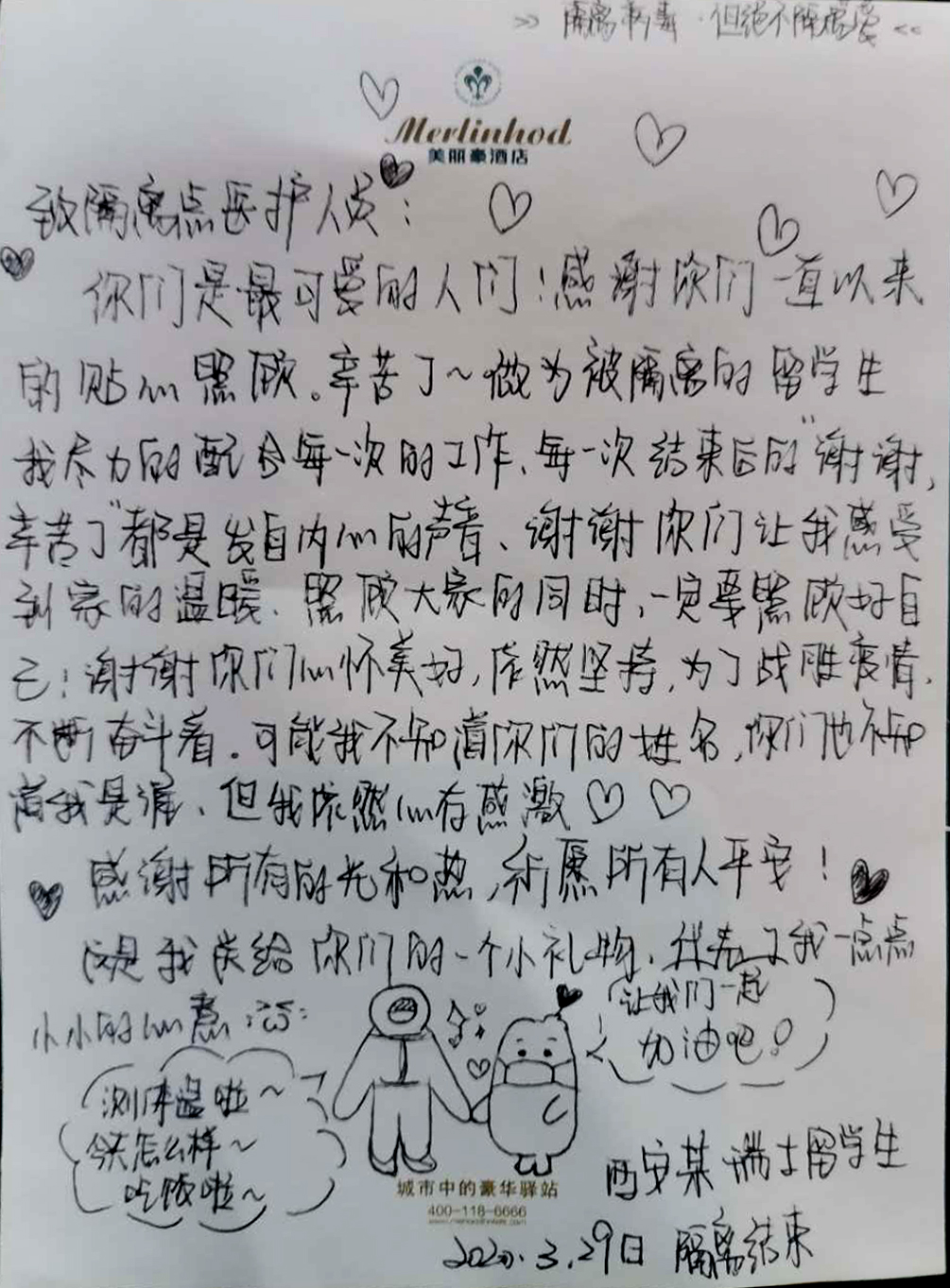 當我們每次拖著疲憊的身體回房間時,看到多封暖心的感謝信,信中表示我們工作很辛苦,對我們衷心的感謝,期待我們也平安而歸,瞬間心暖,再累也值得,我想這是對我們最大的安慰和鼓勵??粗晃晃坏母綦x期滿的人員笑容滿面的離開,我們也算是心愿以償,一定不負校醫(yī)院院領導的重托,全力以赴地戰(zhàn)勝疫情,期待疫去花開,大家生活平安健康,我們平安而歸。