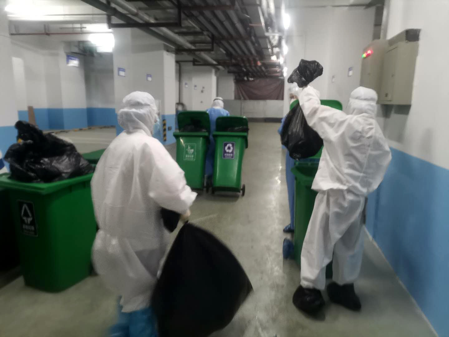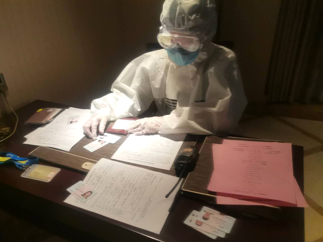 2020年4月1日晚,我們向往常一樣迅速穿好防護服進入隔離區(qū)開始夜班的工作。接班后首先要通知當天夜里需要解除隔離的人員,告知他們收拾好行李,等待解禁時間到來,把他們帶到安全通道,消殺完畢,辦理解禁手續(xù),看著他們平安的回家,大家心里也很欣慰。每天夜里11:00,我們需要把將近20個樓層的垃圾,全部裝袋運送到樓下。夜班組多數(shù)是女孩子,看著樓下堆積如山的黑色袋子,望著姑娘們堅強的身影,心中總會不禁感慨,只要我們齊心協(xié)力,一定會疫去花開,抗疫勝利。凌晨1:00以后,將會有很多境外回國的人員被指揮中心送來,對這些人員和他們的行李進行消殺后,開始登記每一位隔離人員身份信息,記錄航班號、座位號,并且詢問一些病史,有沒有發(fā)熱、氣促、咳嗽等等,測完體溫后將他們按照國籍分配到不同的樓層。遇到高峰期,每晚通常可以收入幾十人次。每次到后半夜的時候,已連續(xù)工作4-5個小時,又渴又累又困,由于防護物資的緊缺,我們都能默默的忍耐著口渴,避免上廁所,以免造成防護物品的浪費。沒有任務的時候大家抓緊時間休息,桌子、沙發(fā)、地板都是我們休息的地方。就這樣,一直到第二天早晨8:00交班迎接新的一天。