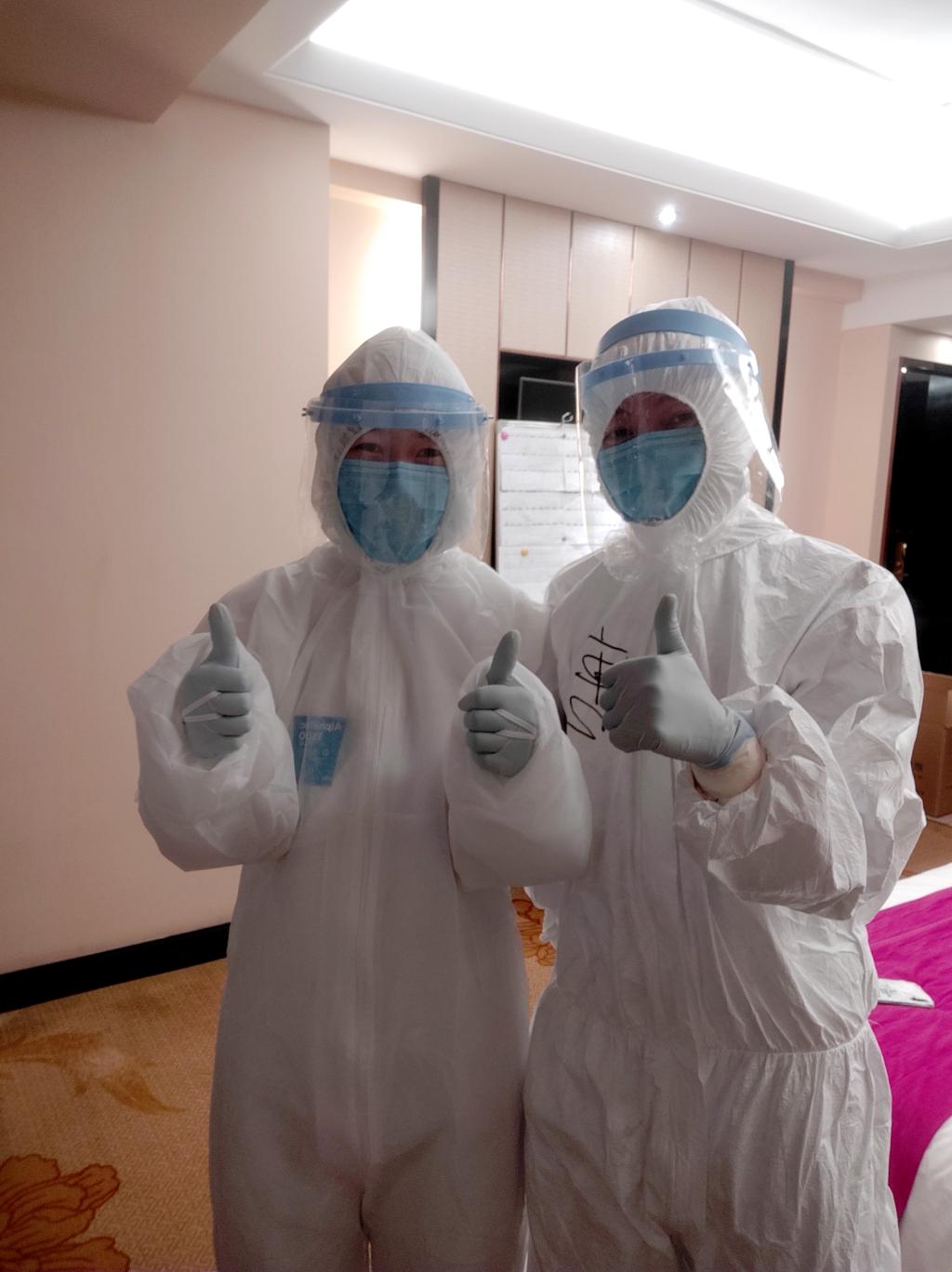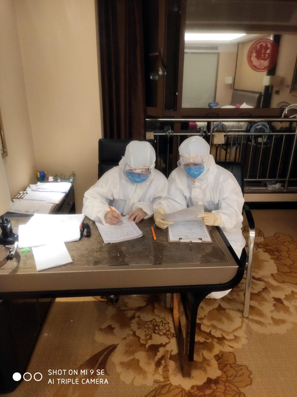3月22日早上發(fā)餐時, 據(jù)了解在集中隔離的人員中有位身患高血壓,心肌梗塞以及腦梗塞的病人,一直有服藥時,且近期藥品快沒了,而且擔心會因旅途勞頓而致其不適,目前7人的醫(yī)療組里內科專業(yè)的醫(yī)生只有我和姚剛,我們發(fā)揮了專業(yè)特長,耐心的詢問并記錄他的既往病史及服藥史,及時與其配備所需藥品,并在不影響他們休息時,隨時電話或當面溝通他的現(xiàn)狀,讓他在隔離期內不會因為自己的疾病而影響他的心情。中午我和姚剛在隔離區(qū)內上班時,突然接到工作組通知,此人于午飯后,突然出現(xiàn)眩暈、頭痛等不適,我們立即跑去查看,因手邊無任何醫(yī)療器械,只能一邊詢問一邊安撫患者的煩躁情緒,并通過上級工作組緊急協(xié)調來一個血壓計,耐心問診及粗略檢查后才發(fā)現(xiàn),因近期飲食單一,且無法保證足夠的活動量,便秘明顯,而中午如廁時出現(xiàn)的短暫性血壓升高所致,立即通過工作組聯(lián)系酒店調整其為特殊餐,并告知其他個人應該注意的事項,每天至少一次問有無病情變化及情緒的波動,以保證其安全平穩(wěn)的度過隔離期。過后他拉著我們的手說:“你們真的是很辛苦,特別感謝你們這一段時間的照顧”對著我們的工作人員深深地鞠了一躬,當時我瞬間濕了眼眶,因為我感受到的是國家的包容和民族的凝聚力,正因如此,才能使的我國渡過難關。
