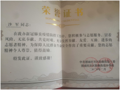 近日,化學化工學院收到一封特殊的來信,函件來自中共渭南市經(jīng)開區(qū)陽曲街道工委,對化工研1801班沙軍同學在當?shù)匾咔榉揽毓ぷ髦凶龀龅呢暙I提出褒揚,并感謝學校對人才的培養(yǎng)。表揚信中說,沙軍同學主動請纓加入當?shù)乜挂呦蠕h志愿服務隊,在工作中積極作為、吃苦耐勞、表現(xiàn)積極,充分展現(xiàn)了新時代青年大學生的風采,當?shù)亟值拦の?/span>對沙軍同學等優(yōu)秀志愿者進行了榮譽表彰。據(jù)了解,從1月底開始,沙軍同學就一直志愿工作在當?shù)氐囊咔榉揽貞狈株?,承擔起對進出人員及車輛進行登記、消毒、宣傳等疫情防控工作。他表示:“疫情暴發(fā)時,黨和國家立即組織力量投入到救治防控中,每次在抖音上看到新聞時,我都十分感動。就我們村而言,有人捐款捐物資,有人義務消毒滅殺細菌,也有人上門講解國家防控政策。就我個人而言,也是渴望著能為這次疫情防控做一點貢獻,所以我主動報名加入到我們村的志愿服務活動中,為家鄉(xiāng)的疫情防控工作奉獻自己微弱的力量”。面對當?shù)卣陌龘P,沙軍同學羞赧地表示他只是做了他認為正確的事,今后他將化褒揚為動力,繼續(xù)做好志愿服務,用實際行動做出表率。
