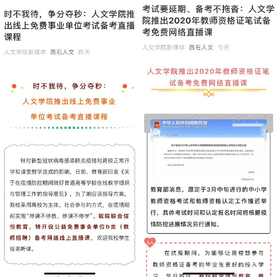 第二,課程輔導(dǎo),安心備考。因疫情影響,國家各類型大型考試均延期舉行,這為廣大備考學(xué)生提供了充分的復(fù)習(xí)時(shí)間。為了能夠讓報(bào)考教師資格證考試和準(zhǔn)備參加事業(yè)單位考試的學(xué)生更好投入學(xué)習(xí),實(shí)現(xiàn)“停課不停教、停課不停學(xué)”,人文學(xué)院聯(lián)合信恒教育,推出了線上免費(fèi)事業(yè)單位考試備考和教師資格證筆試備考的輔導(dǎo)課程。課程從2月17日起由線上播出、周期為一個(gè)月,充分引導(dǎo)學(xué)生在疫情防控階段合理規(guī)劃個(gè)人時(shí)間、積極學(xué)習(xí)、安心備考。