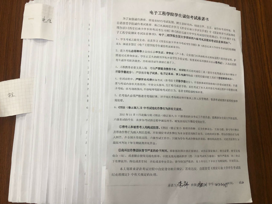 系列活動(dòng)之簽署誠(chéng)信考試承諾書。為進(jìn)一步加強(qiáng)學(xué)生誠(chéng)信意識(shí),將誠(chéng)信考試落到實(shí)處,確保將考試相關(guān)紀(jì)律要求傳達(dá)給每一名同學(xué),堅(jiān)決抵制作弊行為,各班級(jí)印制承諾書,組織各班級(jí)同學(xué)簽署誠(chéng)信考試承諾書,要求同學(xué)們謹(jǐn)記承諾內(nèi)容,克服僥幸心理,自覺抵制作弊行為,力求達(dá)到教育廣大學(xué)生誠(chéng)信考試的目的,激發(fā)學(xué)生學(xué)習(xí)動(dòng)力。