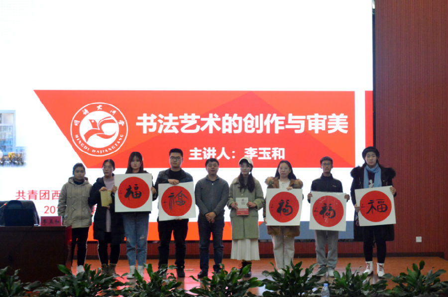 12月27日下午,由校團(tuán)委主辦的第六十五期明德大講堂在鄠邑校區(qū)圖書館弘石報告廳成功舉辦。陜西省青年文學(xué)協(xié)會副主席李玉和老師應(yīng)邀作了題為《書法藝術(shù)的創(chuàng)作與審美》的講座,鄠邑校區(qū)300余名師生聽取了本次講座。