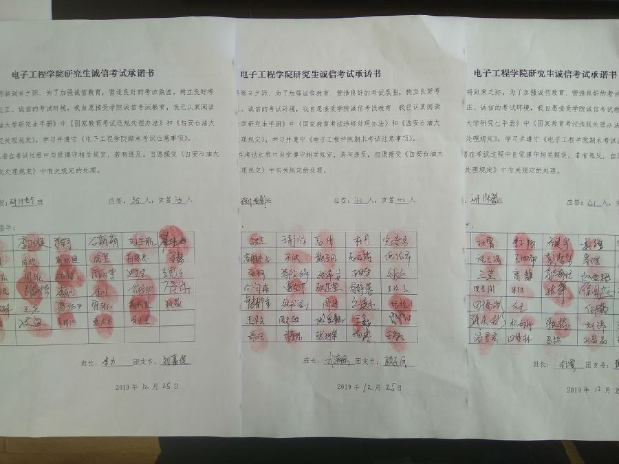 最后,周老師帶領(lǐng)同學(xué)們學(xué)習(xí)了《電子工程學(xué)院期末考試注意事項(xiàng)》,全體2019級研究生現(xiàn)場簽署了《電子工程學(xué)院研究生誠信考試承諾書》并鄭重按下個(gè)人手印。同學(xué)們表示,在日后學(xué)習(xí)生活中將牢記學(xué)校 “兩個(gè)紅線”教育,誠信考試、本分做人,用勤奮踏實(shí)的作風(fēng)譜寫人生華章,用真才實(shí)學(xué)報(bào)效國家,回報(bào)社會(huì)。