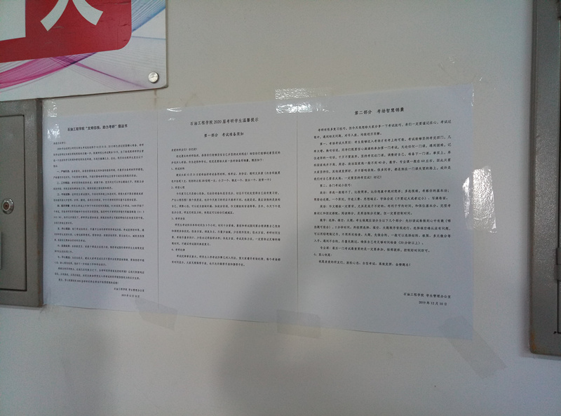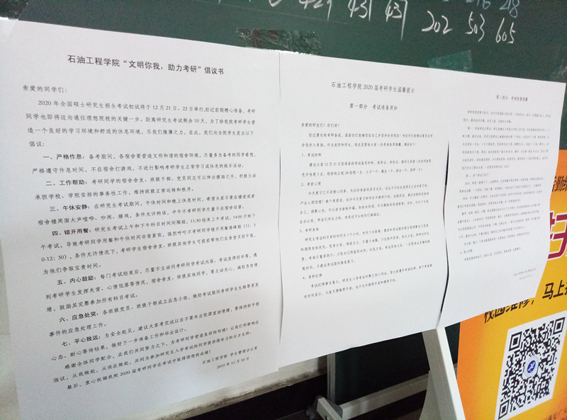 為了給我院考研學生營造一個良好的學習氛圍和舒適的休息環(huán)境,便于他們順利進行最后沖刺和完成為期兩天的全國碩士研究生入學考試。12月10日,在學院領(lǐng)導的指示和引導下,石油工程學院2016級在畢業(yè)班學生所住10號宿舍樓公告欄、各樓層樓梯口、考研自習室等處張貼了主題為“文明你我,助力考研”倡議書。