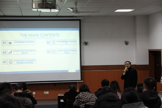 啟動儀式后,羅劍朝教授學(xué)術(shù)報告會順利舉行。經(jīng)濟(jì)管理學(xué)院院長王君萍教授、副院長李俊亭副教授以及部分教師與研究生共100余人參加報告會。羅劍朝教授以《金融改革創(chuàng)新與鄉(xiāng)村振興》為題,就金融的定義與主要特征、金融發(fā)展現(xiàn)狀與存在問題、鄉(xiāng)村振興背景下金融改革的主要內(nèi)容、金融創(chuàng)新發(fā)展、金融改革創(chuàng)新的難點與未來趨勢等內(nèi)容進(jìn)行了分析與介紹,并就課題申報中的選題標(biāo)準(zhǔn)、申請書的邏輯自洽性等問題與與會老師進(jìn)行了深入探討。羅教授的報告深入淺出、內(nèi)容豐富、信息量大。與會老師聆聽完報告后紛紛表示,深受啟發(fā),收獲頗豐。