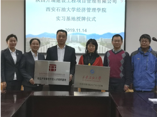 2019年11月14日上午,經(jīng)濟管理學院與陜西開瑞建設工程項目管理有限公司舉行了“陜西開瑞建設工程項目管理有限公司校企產(chǎn)學研合作及人才培養(yǎng)基地”和“西安石油大學經(jīng)濟管理學院生產(chǎn)實習基地”的授牌儀式。陜西開瑞公司靳祥德總工程師、董文娟副總經(jīng)理和經(jīng)濟管理學院院長王君萍教授、教學辦袁靜老師及工程管理專業(yè)有關老師出席了本次授牌儀式。