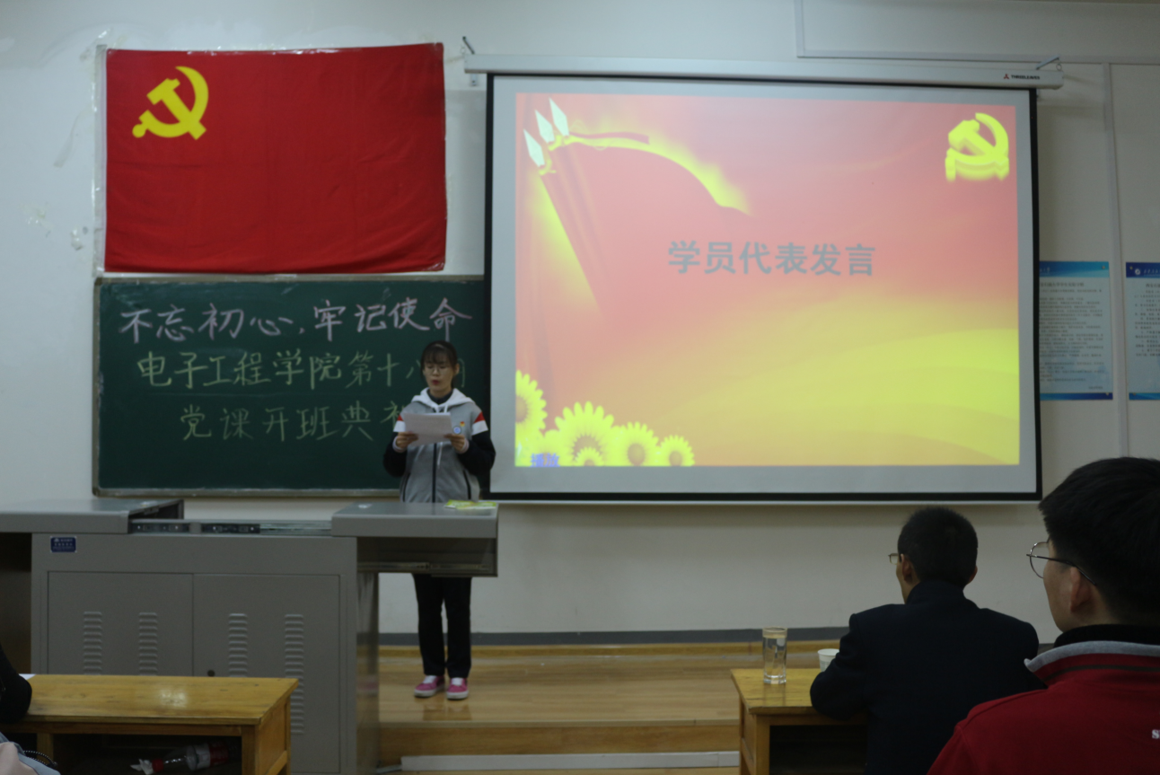 開班典禮在悠揚的國際歌聲中正式拉開帷幕。首先,由上期優(yōu)秀學員代表測控1802班的東怡同學和本期學員代表測控1903班劉東瓚同學進行發(fā)言,他們的發(fā)言充分展現(xiàn)了入黨積極分子們良好的精神風貌,以及積極向黨組織靠攏的決心。隨后,由學生管理辦公室主任、團委書記周毅華宣讀了黨課紀律要求,對參訓學員做出了嚴格的要求。最后,由電子工程學院黨委副書記畢軼慧老師致辭,“學有所思,思有所得”是畢老師對學員的一種要求,也是一種期盼。