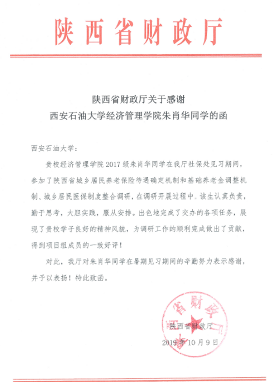 ?近日,陜西省財政廳向我校經(jīng)濟管理學(xué)院發(fā)來感謝函,對我校2017級會計專業(yè)碩士朱肖華同學(xué)提出表揚,高度評價該同學(xué)在暑期見習(xí)期間的工作表現(xiàn)。