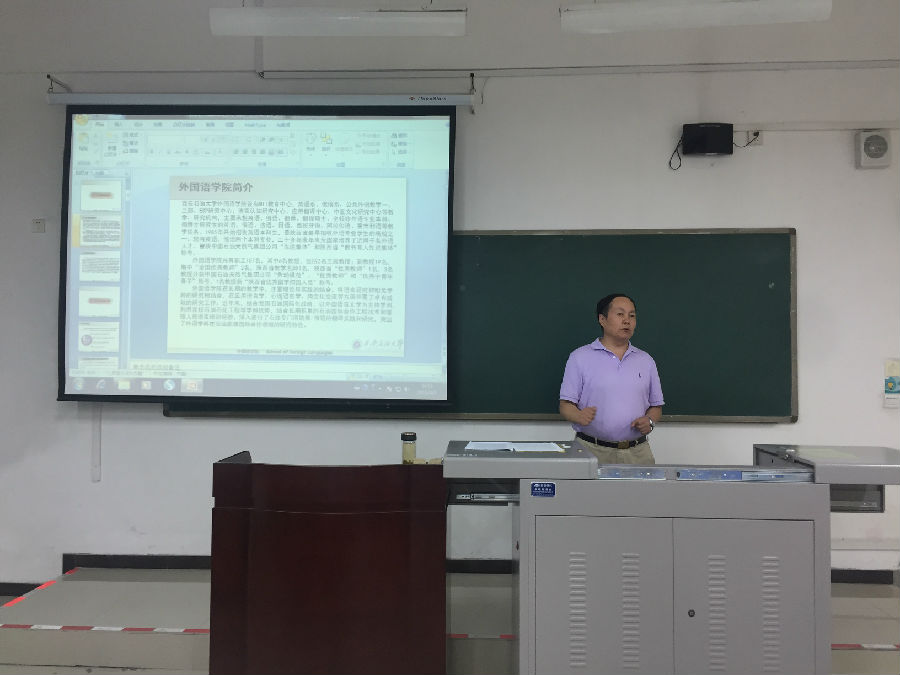 外國(guó)語(yǔ)學(xué)院教授委員會(huì)主任袁森教授從師資隊(duì)伍、學(xué)科建設(shè)、專業(yè)建設(shè)、專業(yè)就業(yè)前景、辦學(xué)條件等方面的具體向大家介紹了外國(guó)語(yǔ)學(xué)院翻譯碩士授權(quán)點(diǎn)的情況,為他們更好地融入研究生學(xué)習(xí)生活奠定了基礎(chǔ)。
