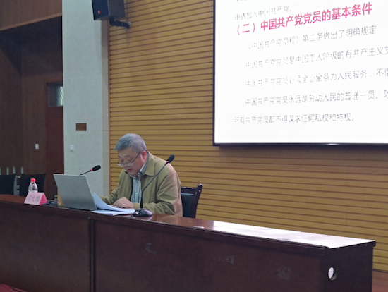 典禮結束后,閆書記以“明確共產(chǎn)黨員條件,確立遠大政治追求”為題,為學員們講授黨課第一講。他從“當代大學生為什么要入黨”展開,詳細闡述了共產(chǎn)黨員的條件、權利與義務,以及入黨程序等方面內(nèi)容。他希望學員們能夠確立政治上的遠大追求,樹立崇高信念,加強自身修養(yǎng),自愿接受黨組織的考驗,早日實現(xiàn)自己的人生目標和理想。