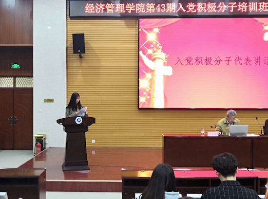 經(jīng)濟管理學院組織員武威老師宣讀了黨課考核標準,并介紹了課程安排。入黨積極分子代表國貿(mào)1801班丁鉞凡同學作了表態(tài)發(fā)言。