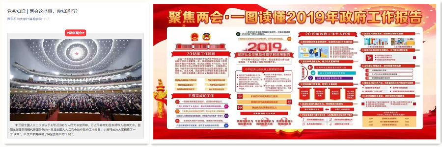 積極關(guān)注“兩會”動態(tài),加強“兩會”知識宣傳。學(xué)院依托“西油計”微信公眾號、微信群、QQ群和展板等多種平臺,集中開展“‘兩會’那些事兒”、“一圖看懂2019年政府工作報告”等知識點宣傳,實現(xiàn)宣傳進(jìn)教研室、進(jìn)年級、進(jìn)支部、進(jìn)班級、進(jìn)宿舍。