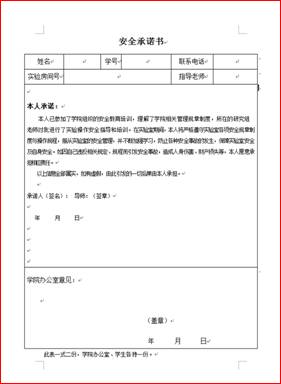 五是簽訂承諾書。為了增強(qiáng)學(xué)生的實(shí)驗(yàn)安全責(zé)任意識,確保學(xué)生認(rèn)真參加學(xué)院的相關(guān)安全培訓(xùn),約束學(xué)生認(rèn)真規(guī)范實(shí)驗(yàn)操作流程,服從實(shí)驗(yàn)室安全管理規(guī)定,學(xué)院開展簽訂承諾活動,在及時(shí)參與學(xué)習(xí)、參加培訓(xùn),接受指定教師指導(dǎo)的基礎(chǔ)上,每名參與實(shí)驗(yàn)的同學(xué)簽訂安全承諾書,確保實(shí)驗(yàn)安全及學(xué)生人身安全,有效保證了教學(xué)科研的順利進(jìn)行。