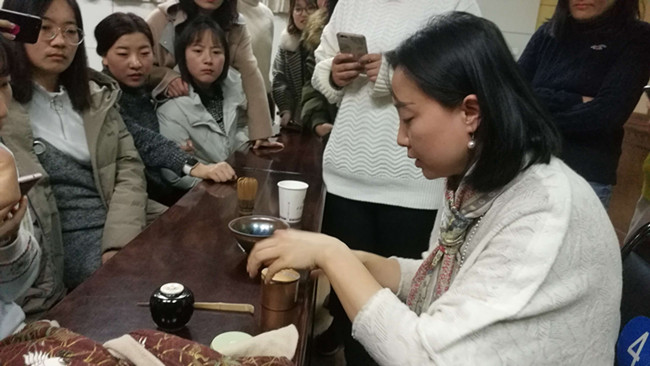 任軒老師結(jié)合唐宋時(shí)期的詩(shī)詞,深入剖析古人品茶、鑒茶的視野,從采茶、制茶、泡茶等多個(gè)角度將日本茶道和中國(guó)茶藝進(jìn)行對(duì)比,闡釋了不同國(guó)家茶文化的內(nèi)涵。最后,任軒老師現(xiàn)場(chǎng)進(jìn)行了茶藝展示表演,贏得同學(xué)們陣陣掌聲。