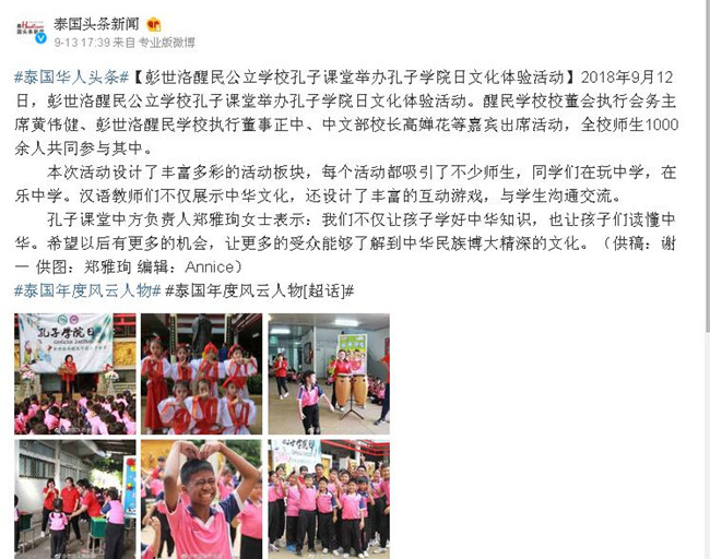 近日,人文學(xué)院漢語(yǔ)國(guó)際教育專業(yè)17級(jí)研究生在泰國(guó)醒民學(xué)校孔子課堂舉辦了孔子學(xué)院日活動(dòng)。這是由并國(guó)家漢辦、孔子學(xué)院發(fā)起,世界各地孔院同時(shí)舉辦,為紀(jì)念孔子學(xué)院建設(shè)發(fā)展的重要慶?;顒?dòng),其目的是宣揚(yáng)中華文化,推廣漢語(yǔ)教育。此次活動(dòng)被泰國(guó)華人頭條網(wǎng)報(bào)道,受到了當(dāng)?shù)匦nI(lǐng)導(dǎo)和學(xué)生們的一致認(rèn)可和高度評(píng)價(jià)。