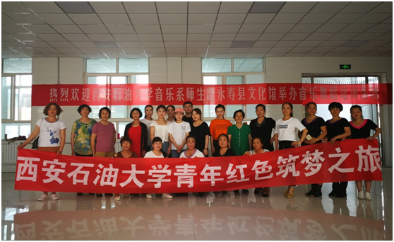 為全面貫徹落實(shí)習(xí)近平總書記回信精神,在校工會(huì)聯(lián)系下音樂(lè)系與永壽縣文化館開展結(jié)對(duì)子活動(dòng),引導(dǎo)青年扎根大地,了解國(guó)情、民情,助力教育扶貧,實(shí)現(xiàn)文化惠民。6月29日~7月2日為永壽縣文化館開展舞蹈、音樂(lè)培訓(xùn)活動(dòng)。何云老師、張萌萌同學(xué)精心準(zhǔn)備了適應(yīng)不同年齡段人群的藏舞、現(xiàn)代舞和拉丁舞;甘璐瑤等同學(xué)為永壽縣聲樂(lè)愛好者從呼吸、發(fā)聲、演唱技巧和樂(lè)理知識(shí)等方面進(jìn)行指導(dǎo)。本次活動(dòng)有近150名文藝愛好者參與,充分彰顯了我系的專業(yè)優(yōu)勢(shì),提升師生的實(shí)踐能力,發(fā)揮音樂(lè)育人的作用,將藝術(shù)實(shí)踐與教育扶貧相結(jié)合,促進(jìn)了永壽縣基層文藝隊(duì)伍建設(shè)。