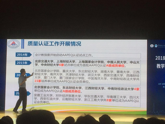 首先,全國(guó)會(huì)計(jì)專業(yè)學(xué)位研究生教育指導(dǎo)委員會(huì)秘書長(zhǎng)王化成教授簡(jiǎn)要介紹了我國(guó)現(xiàn)階段MPAcc項(xiàng)目的發(fā)展情況,對(duì)2017年全國(guó)MPAcc教育工作進(jìn)行了詳細(xì)的總結(jié),并深入探討了未來MPAcc教育發(fā)展思路。他同時(shí)提出,在當(dāng)今MPAcc培養(yǎng)單位數(shù)量快速增加且培養(yǎng)學(xué)生的人數(shù)初具規(guī)模的情況下,各MPAcc培養(yǎng)單位應(yīng)當(dāng)致力于提升辦學(xué)質(zhì)量,注重改革創(chuàng)新,推進(jìn)會(huì)計(jì)碩士專業(yè)學(xué)位教育改革。隨后,來自東北大學(xué)的于麗萍教授、北京國(guó)家會(huì)計(jì)學(xué)院的賀穎奇教授、東北財(cái)經(jīng)大學(xué)的陳艷利教授、江西財(cái)經(jīng)大學(xué)的章衛(wèi)東教授及中南財(cái)經(jīng)政法大學(xué)的王昌銳教授分別向與會(huì)代表分享了各自院校MPAcc的項(xiàng)目特色和培養(yǎng)經(jīng)驗(yàn)。會(huì)議最后,全國(guó)會(huì)計(jì)專業(yè)學(xué)位研究生教育指導(dǎo)委員秘書處辦公室主任王永研詳細(xì)解讀了《2018年會(huì)計(jì)碩士專業(yè)學(xué)位授權(quán)點(diǎn)專項(xiàng)評(píng)估方案》,以幫助各院校更好地開展專項(xiàng)評(píng)估工作,進(jìn)一步提升MPAcc項(xiàng)目培養(yǎng)質(zhì)量。同時(shí),會(huì)議還為包括北京國(guó)家會(huì)計(jì)學(xué)院、東北財(cái)經(jīng)大學(xué)會(huì)計(jì)學(xué)院、江西財(cái)經(jīng)大學(xué)會(huì)計(jì)學(xué)院、中南財(cái)經(jīng)政法大學(xué)會(huì)計(jì)學(xué)院在內(nèi)的4所新增會(huì)計(jì)專業(yè)學(xué)位教育質(zhì)量認(rèn)證(AAPEQ)成員單位頒發(fā)證書。