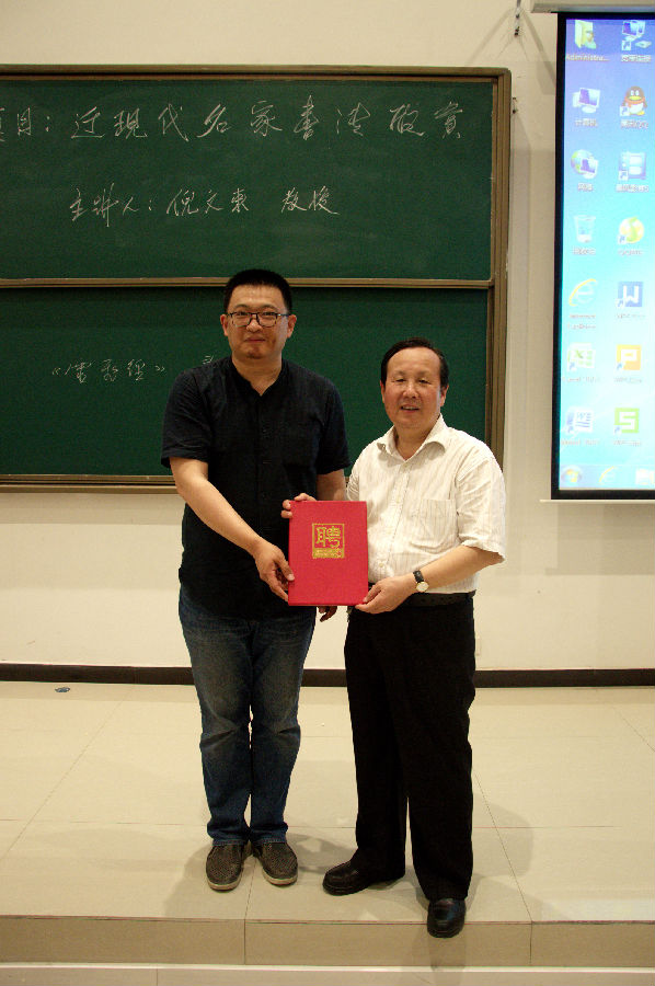 倪文東教授選取了于右任、李叔同、沈尹默、沙孟海、啟功等十位近現(xiàn)代書(shū)法名家,結(jié)合其生平事跡、學(xué)書(shū)經(jīng)歷分析了其書(shū)法造詣、枚舉了其書(shū)法創(chuàng)新特點(diǎn)、評(píng)價(jià)了其在中國(guó)書(shū)法史上的重要地位。倪教授認(rèn)為書(shū)法非寫(xiě)字,中國(guó)書(shū)法根植于博大精深的中國(guó)傳統(tǒng)文化,學(xué)書(shū)必要有深厚的學(xué)養(yǎng)、廣博的積淀再加以超乎常人的勤學(xué)苦練方可有所成就。倪教授告誡學(xué)子們,功夫在“書(shū)”外,學(xué)書(shū)要以提高自身的文化素質(zhì)修養(yǎng)為前提。倪教授的講座深入淺出、詼諧風(fēng)趣,贏得了老師、學(xué)生們的陣陣掌聲。