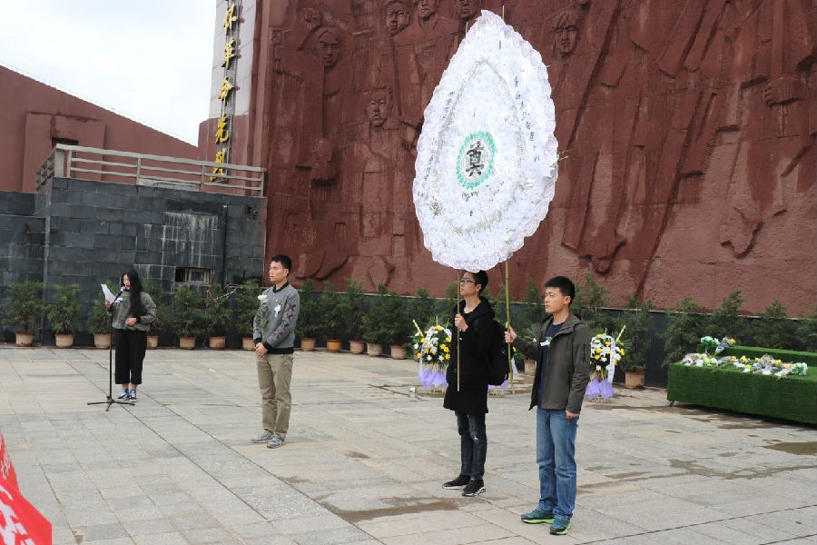 商管類1702班唐穎作為代表致悼詞。她說到,矗立在大家面前的烈士豐碑,訴說著英雄們光榮而無悔的事業(yè),歲月的風(fēng)塵早已在它身上刻下斑駁的印記,讓大家無法不回想起那段滄桑沉重的往事。七百余位革命烈士長眠于此。他們?yōu)樽非缶葒让竦恼胬頀侇^顱,灑熱血;為中華民族的解放事業(yè)前仆后繼,視死如歸。作為新時代的莘莘學(xué)子,更應(yīng)充滿愛國之情,樹立報國之心,努力學(xué)習(xí),繼承先烈遺志,為家鄉(xiāng)的建設(shè)、為祖國的富強而努力奮斗。