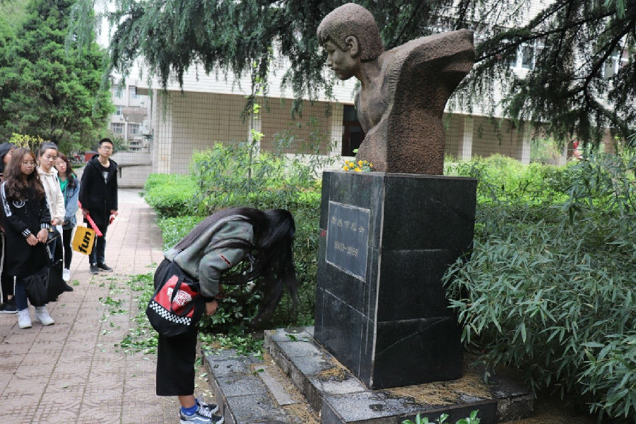 離開烈士陵園后,大家步行至我校雁塔校區(qū),在烈士唐春雨和王進喜的雕像前,行鞠躬禮,以表達崇敬和懷念之情。