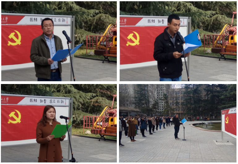 在雄壯的《國(guó)際歌》聲,石工類2016級(jí)第一黨支部何接宣布宣誓儀式正式開始。110名新黨員面向黨旗,舉起右手,在領(lǐng)誓人研究生院機(jī)械類2016級(jí)第一黨支部趙華東的逐句領(lǐng)讀下,用慷慨激昂的語(yǔ)氣,莊嚴(yán)向黨旗宣誓,表達(dá)對(duì)黨的忠誠(chéng)、為共產(chǎn)主義事業(yè)奮斗終身的決心。其他參會(huì)人員與新黨員一同宣誓,重溫入黨誓詞。新黨員代表研究生院石工類2015級(jí)第一黨支部劉夢(mèng)文同學(xué)作了表態(tài)發(fā)言,結(jié)合研究生日常學(xué)習(xí)工作生活,談了一名共產(chǎn)黨員的擔(dān)當(dāng)和責(zé)任,表明了自己投身黨的事業(yè)的決心和勇氣。