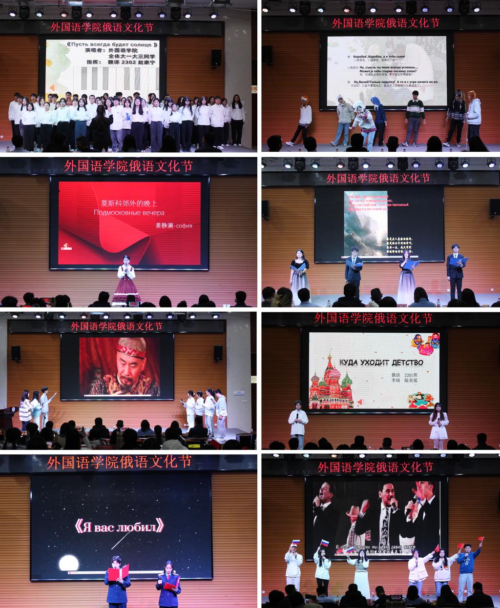 本屆俄語文化節(jié)由俄語歌曲串燒、普希金詩歌朗誦、俄語短劇表演、影視短劇翻譯配音表演以及外語書法大賽等環(huán)節(jié)組成?;顒蝇F場熱鬧非凡,節(jié)目題材豐富、精彩紛呈,有機融合了中國和俄羅斯文化元素。俄語專業(yè)學生用明快、激昂的大合唱拉開了俄語文化節(jié)的序幕;詩朗誦《致大?!?,讓大家感受到普希金追求光明、謳歌自由的思想情感;話劇《小圓面包》,用可愛豐富的肢體語言和流利的口語表現出學生良好的俄語語言功底;翻譯配音影視劇片段《甄嬛傳》和《功夫熊貓》將活動氣氛推向高潮;俄語歌曲串燒《幸福鳥》、《莫斯科郊外的晚上》、《致青春》唱出了俄語專業(yè)學生朝氣蓬勃的精神風貌;由西安鐵路職業(yè)技術學院的學生帶來的詩朗誦《我曾經愛過你》以及俄語歌曲《小鬧鐘》讓大家眼前一亮;詩朗誦《假如生活欺騙了你》將普希金語言的魅力展露無遺;匯演在俄語專業(yè)2021級學生帶來的歌舞劇《冬日》中落下帷幕。