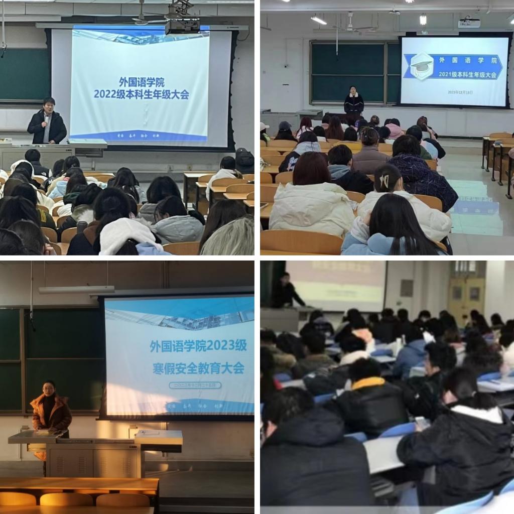 為進一步增強學生安全防范意識,切實做好寒假期間學生教育管理工作。近日,外國語學院各年級召開寒假假期安全教育大會。