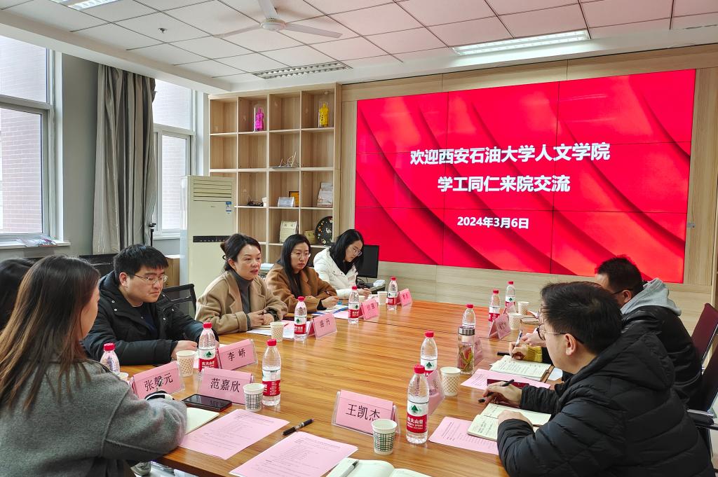 為落實西安石油大學(xué)第三次黨代會精神,進一步提高學(xué)工干部工作能力和管理水平,更高質(zhì)量開展學(xué)生教育管理,多措并舉提升思想政治工作實效。3月6日,根據(jù)《西安石油大學(xué)人文學(xué)院學(xué)工干部訪學(xué)提質(zhì)計劃》安排,人文學(xué)院黨委副書記盛丹帶領(lǐng)學(xué)院全體學(xué)工干部赴西北政法大學(xué)新聞傳播學(xué)院、西安郵電大學(xué)數(shù)字藝術(shù)學(xué)院調(diào)研學(xué)習(xí)。