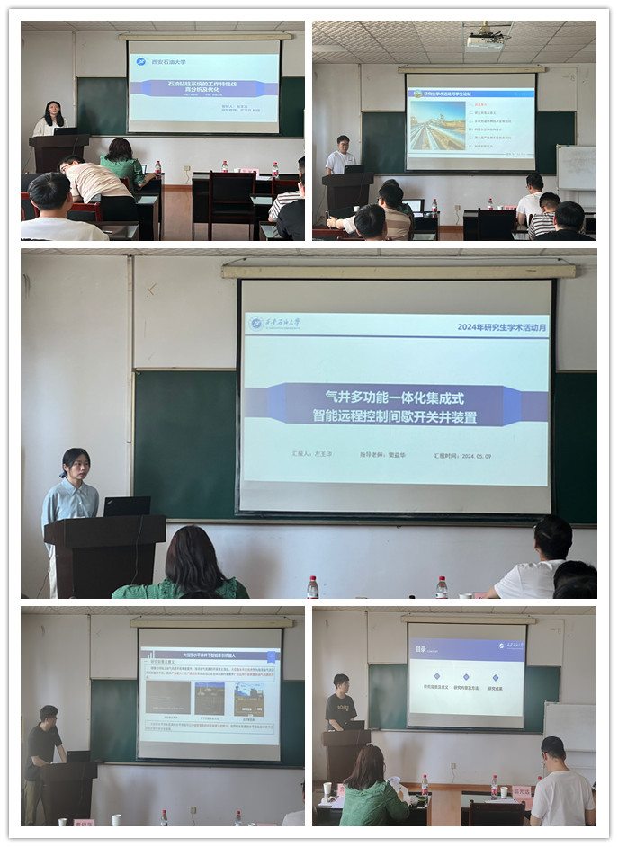 2021級研究生張文溪和裴龍瑤、2022級研究生尚祖躍、左王印和王亨通,分別作了題為《石油鉆柱系統(tǒng)的工作特性仿真分析及優(yōu)化》《超音速分離管內(nèi)自發(fā)凝結(jié)及氣液分離過程研究》《管道檢測機器人關(guān)鍵技術(shù)》《氣井多功能一體化集成式智能遠程控制間歇開關(guān)井裝置》《大位移水平井井下智能牽引機器人》的報告。
