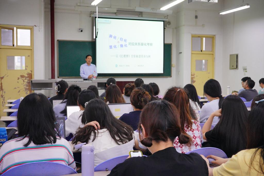 為加強(qiáng)研究生基礎(chǔ)知識學(xué)習(xí)、培養(yǎng)科研興趣、拓寬學(xué)術(shù)視野及啟迪思維。5月29日下午,外國語學(xué)院特別邀請河南大學(xué)二級教授、博士生導(dǎo)師劉澤權(quán)教授在鄠邑校區(qū)博覽樓A227開展了題為“異化/歸化與顯化/隱化對應(yīng)關(guān)系量化考察——以《紅樓夢》官稱英譯為例”的學(xué)術(shù)講座。外國語學(xué)院翻譯碩士一年級研究生及部分二、三年級學(xué)生聆聽了本次講座。