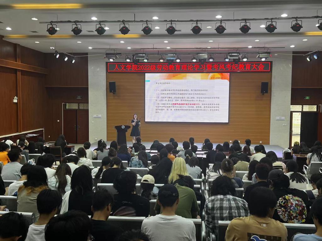 為進一步營造良好的學習氛圍,推進學院學風建設(shè)及班級建設(shè),通過“勞動教育”全面育人、綜合育人、實踐育人,促進學生全面發(fā)展。6月12日下午,人文學院2022級、2023級分別在崇文樓118及博覽樓A139召開勞動教育理論學習暨考風考紀教育大會,2022級、2023級全體學生出席,輔導員范嘉欣、王凱杰主持。