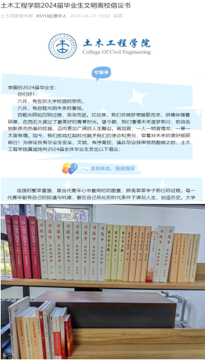 倡議:為加強學(xué)院黨建辦公室讀書角建設(shè),6月8日,土木工程學(xué)院面向41名畢業(yè)生黨員發(fā)出了“我為學(xué)院捐贈一本好書”倡議,為學(xué)院建設(shè)做出綿薄之力。為了讓畢業(yè)生能明確畢業(yè)流程和知悉相關(guān)注意事項,確保順利離校,6月15日,學(xué)院面向全體畢業(yè)生發(fā)出了“土木工程學(xué)院2024屆畢業(yè)生文明離校倡議書”,號召全體畢業(yè)生,牢記習(xí)近平總書記對廣大青年的囑托,爭做有理想、敢擔(dān)當(dāng)、能吃苦、肯奮斗的新時代好青年,在推進強國建設(shè)、民族復(fù)興偉業(yè)中展現(xiàn)青春作為、彰顯青春風(fēng)采、貢獻青春力量,奮力書寫為中國式現(xiàn)代化挺膺擔(dān)當(dāng)?shù)那啻浩隆?/span>