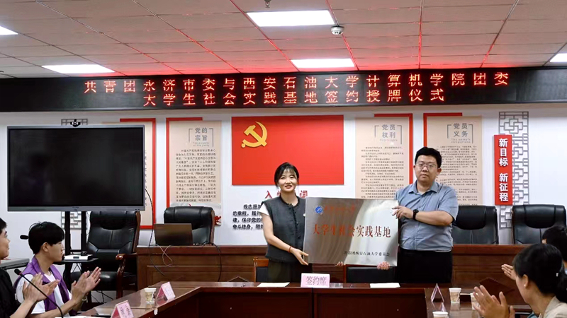 7月8日下午,計(jì)算機(jī)學(xué)院團(tuán)委與共青團(tuán)永濟(jì)市委在永濟(jì)市會議中心櫻花社區(qū)會議室舉行了校地合作簽約授牌儀式。西安石油大學(xué)方面,計(jì)算機(jī)學(xué)院團(tuán)委書記喬曉、2022級團(tuán)總支書記姚謙及10名社會實(shí)踐同學(xué)參加了本次活動(dòng)。永濟(jì)市團(tuán)委書記史曉媛,副書記高卓、樊政君,掛職副書記張國偉出席了儀式。