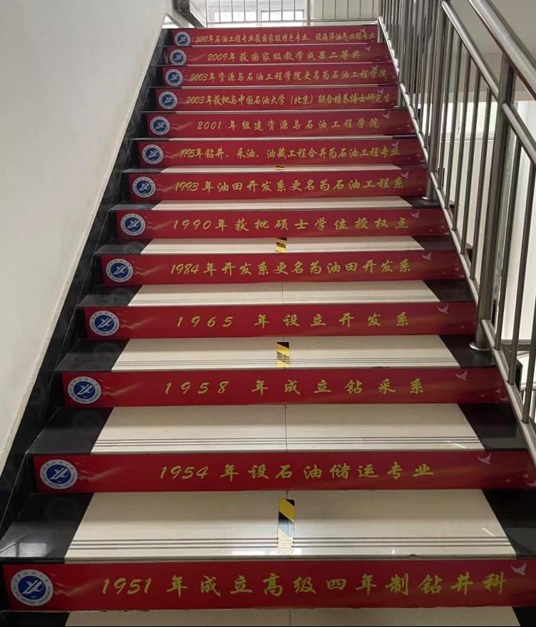 二至三層的樓梯貼紙,展現(xiàn)了學(xué)院從1951年成立高級(jí)四年制鉆井科以來的發(fā)展歷程和輝煌成就,其中包括辦學(xué)特色、專業(yè)體系、師資隊(duì)伍、教學(xué)成果、科研實(shí)力等等,旨在讓廣大師生深入了解學(xué)院的悠久歷史、發(fā)展歷程和辦學(xué)成果,弘揚(yáng)和傳承學(xué)院優(yōu)秀傳統(tǒng),展示學(xué)院發(fā)展風(fēng)貌,增強(qiáng)學(xué)生行業(yè)自信和專業(yè)自信,全面推進(jìn)學(xué)院各項(xiàng)工作高質(zhì)量發(fā)展。