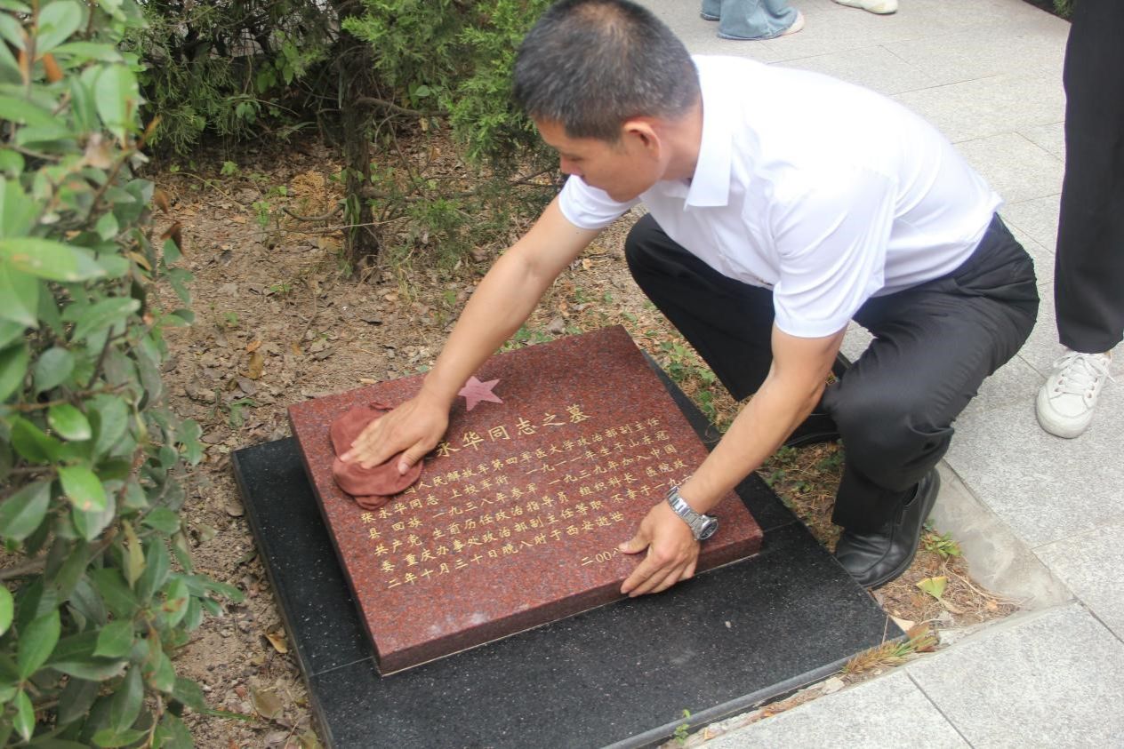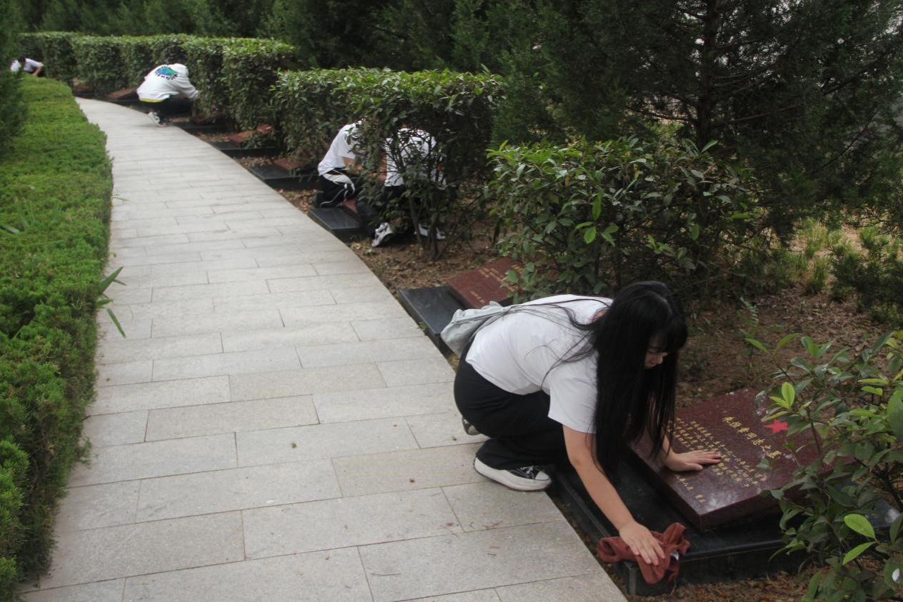 活動(dòng)第三項(xiàng),全體師生擦拭陵園烈士墓碑。大家懷著崇敬的心情,徒手清理墓碑周?chē)碾s草和垃圾,認(rèn)真擦拭所有烈士墓碑,讓墓碑一塵不染,以此來(lái)表達(dá)對(duì)烈士偉大精神的深切思念和緬懷。