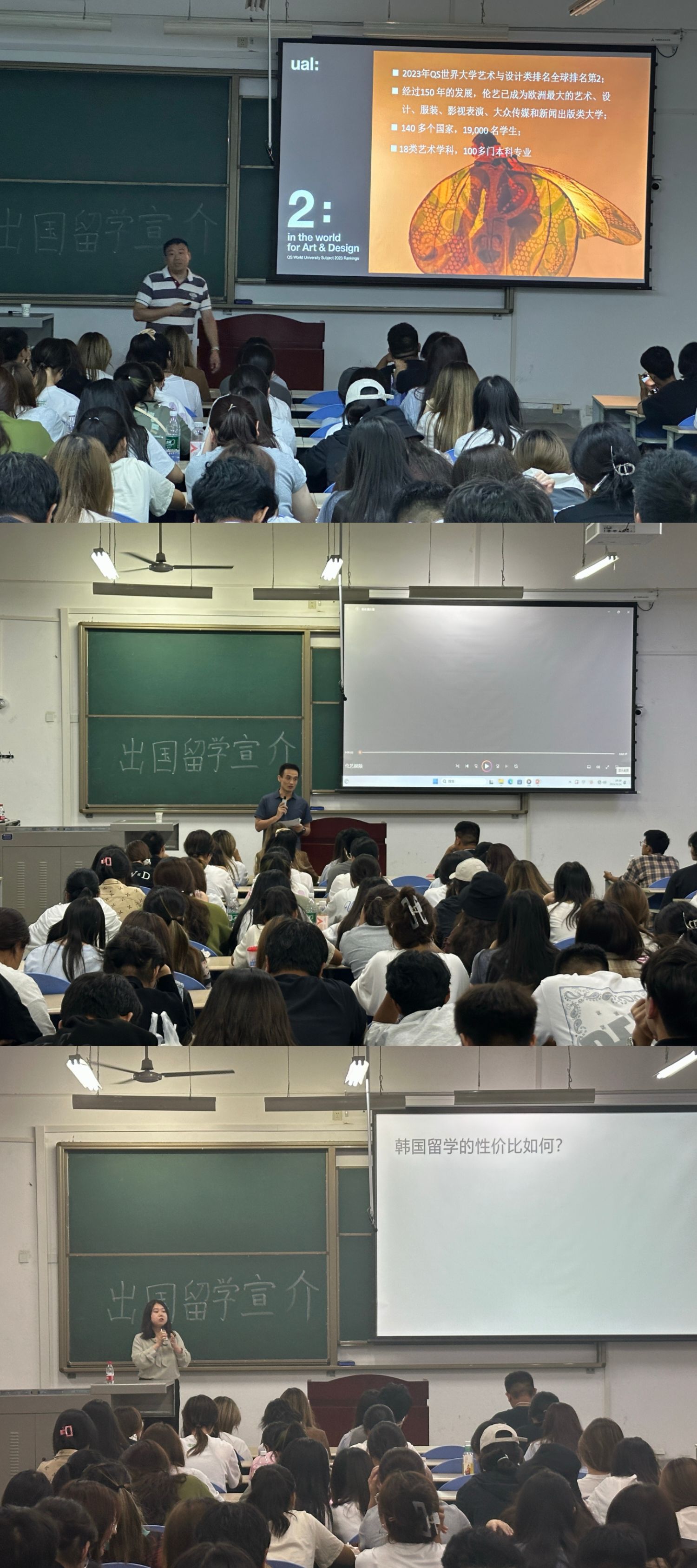 隨后,國(guó)際合作與交流處、國(guó)際教育學(xué)院安排多位熱門留學(xué)項(xiàng)目的負(fù)責(zé)人介紹了相關(guān)項(xiàng)目的具體政策安排、留學(xué)的流程和要求。在場(chǎng)老師對(duì)英國(guó)、美國(guó)、澳洲、韓國(guó)等部分海外留學(xué)熱門國(guó)家和地區(qū)的留學(xué)時(shí)間、費(fèi)用以及語言要求等方面的要點(diǎn)進(jìn)行了一一解讀。現(xiàn)場(chǎng)還詳細(xì)介紹了延世大學(xué)、漢陽大學(xué)、淑明女子大學(xué)等海外高校留學(xué)項(xiàng)目的內(nèi)容,并為學(xué)生們?cè)谶x專業(yè)方面提供了寶貴的建議。各位老師們與學(xué)生進(jìn)行熱烈的互動(dòng)交流,解答學(xué)生們的疑惑與困惑。