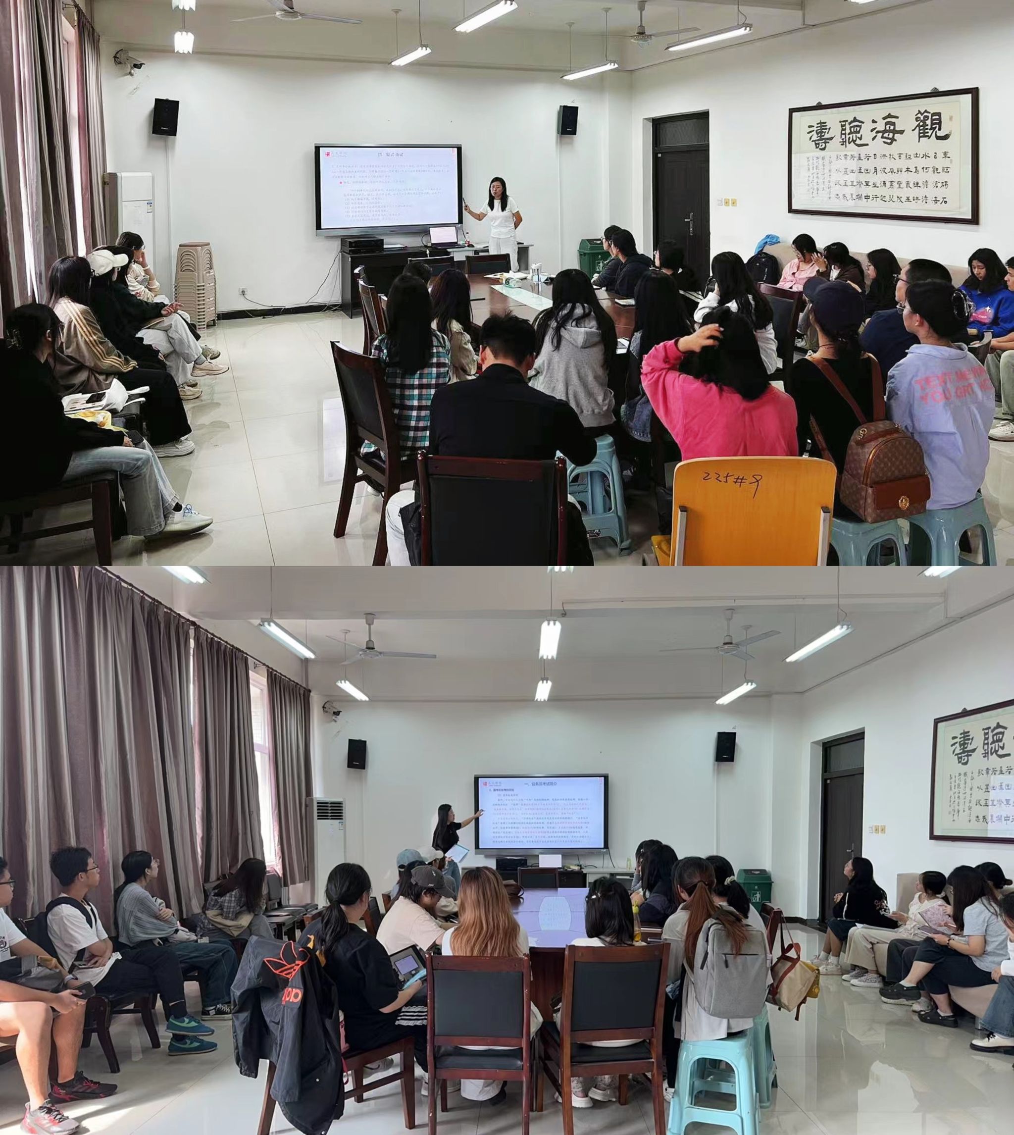 為延續(xù)2024屆畢業(yè)生13名同學(xué)在公務(wù)員考試中上岸的競爭優(yōu)勢,豐富和增加學(xué)院畢業(yè)生的就業(yè)多樣性,幫助2022級學(xué)生提前進(jìn)行職業(yè)生涯規(guī)劃,精準(zhǔn)把握公務(wù)員考試與事業(yè)單位招聘的最新動態(tài),優(yōu)化備考資源,提升備考水平,增強考試能力,營造學(xué)習(xí)氛圍。人文學(xué)院于9月25日、10月8日分兩場為2022級52名為有意向參加公考的學(xué)生舉辦公務(wù)員備考答疑座談會,由學(xué)工辦主任付強主講,輔導(dǎo)員范嘉欣主持。