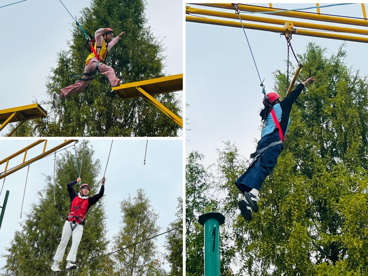 在高空項(xiàng)目體驗(yàn)中,參與同學(xué)根據(jù)分組分別進(jìn)行了“斷橋飛躍”、“高空滑索”和“鋼絲行走”三個(gè)項(xiàng)目。通過(guò)隊(duì)友的鼓勵(lì)和自身的突破,所有同學(xué)由開(kāi)始的恐懼、畏縮,逐漸堅(jiān)定意志,順利的克服了心里障礙。當(dāng)最后一位同學(xué)完成挑戰(zhàn)時(shí),大家不禁發(fā)出了勝利的歡呼,有些同學(xué)還激動(dòng)地流下了眼淚。同學(xué)們紛紛表示,隊(duì)友的鼓勵(lì)以及個(gè)人對(duì)團(tuán)隊(duì)保護(hù)人員的信任促使了勇氣的形成。
