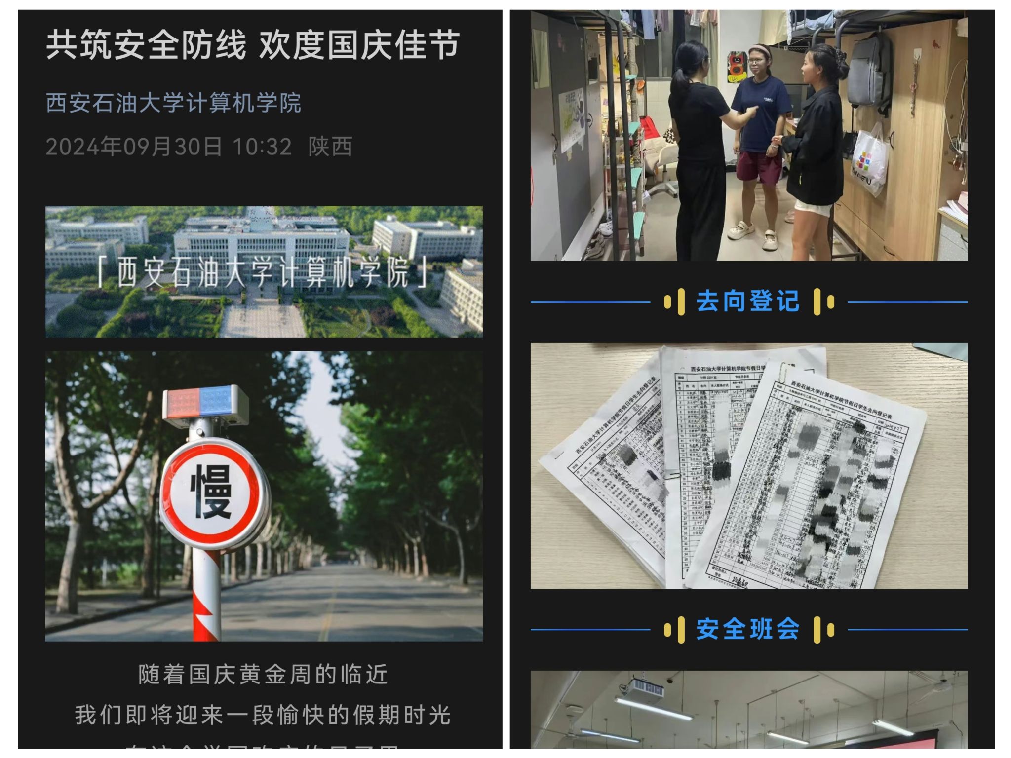 一是在國慶節(jié)前夕,學(xué)院通過公眾號推送《共筑安全防線 歡度國慶佳節(jié)》微信推文,各年級通過召開年級大會、走訪學(xué)生宿舍、假期去向登記、安全主題班會、假期出行安全小貼士等方式,引導(dǎo)同學(xué)們做好自己安全的第一責(zé)任人,確保自身健康安全和學(xué)校的和諧穩(wěn)定。