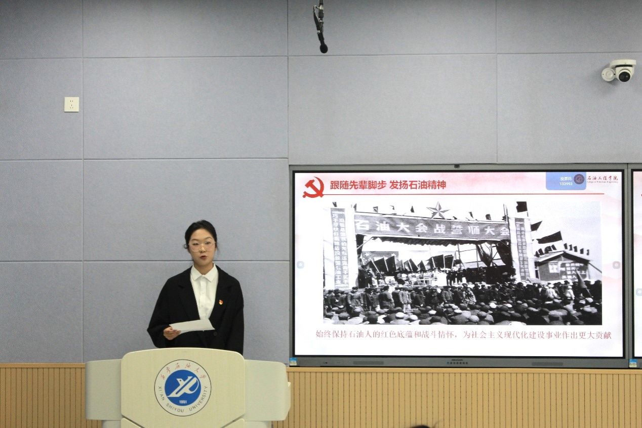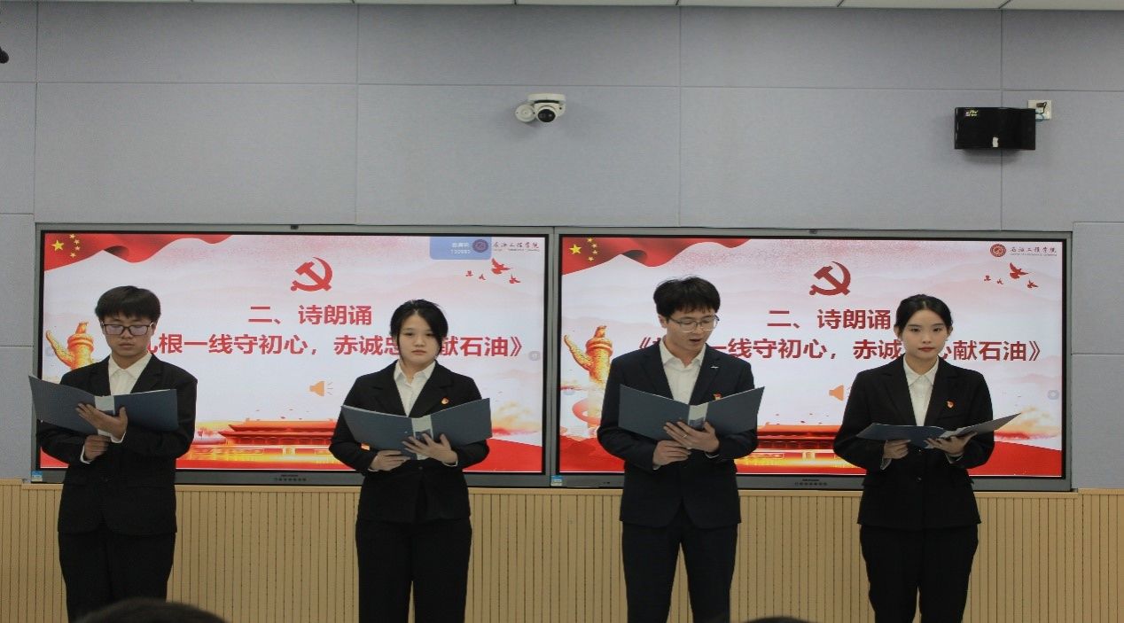 活動(dòng)伊始,參會(huì)同志共同唱響《國(guó)際歌》,堅(jiān)定理想信念。隨后,支部?jī)?yōu)秀預(yù)備黨員張晗喆、彭芃趙嘉博、宋浩婷同志帶來詩朗誦,展現(xiàn)在國(guó)家對(duì)能源需求日益增長(zhǎng)的背景下,百萬石油工人埋頭苦干,以扎扎實(shí)實(shí)的行動(dòng),實(shí)實(shí)在在的業(yè)績(jī),向黨和國(guó)家交出亮麗成績(jī)單的風(fēng)采。接著與會(huì)同志觀看了石油工程學(xué)院已經(jīng)畢業(yè)的扎根一線的黨員為在校學(xué)弟學(xué)妹精心錄取的寄語視頻,學(xué)習(xí)他們奮戰(zhàn)在萬米井場(chǎng)、煉化車間、加油站點(diǎn)等為祖國(guó)的石油事業(yè)默默堅(jiān)守、無私奉獻(xiàn)的精神。