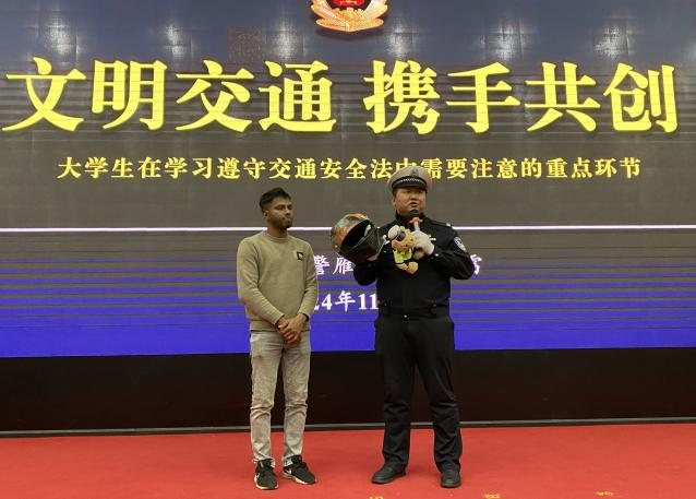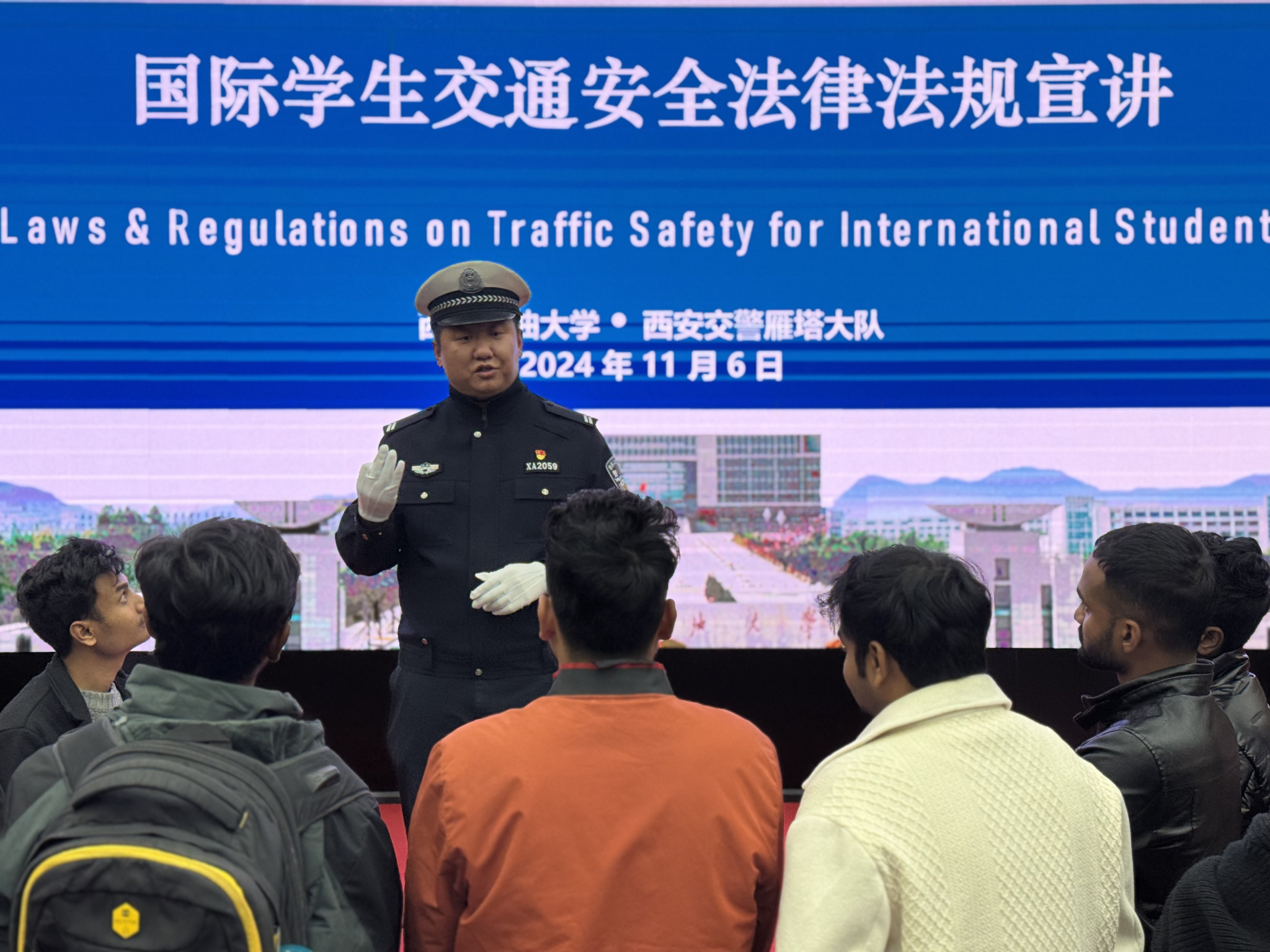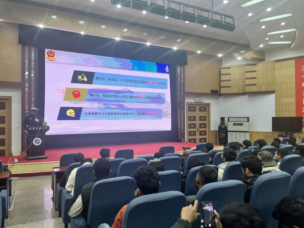 116日下午,國際教育學(xué)院邀請西安市公安局交警支隊雁塔大隊巨雷警官走進校園,為我校國際學(xué)生進行道路交通安全法律法規(guī)教育宣講。會議在雁塔校區(qū)會議中心學(xué)術(shù)報告廳舉行,學(xué)院國際學(xué)生工作辦公室全體輔導(dǎo)員及80余名在校國際學(xué)生參加。