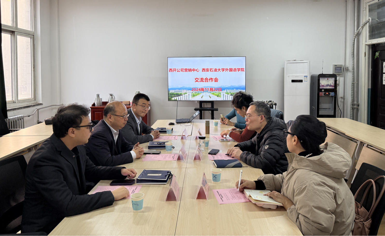 11月22日下午,外國語學院與西安西電高壓開關(guān)公司合作交流會在雁塔校區(qū)華油能源樓727會議室舉行。西安西電高壓開關(guān)公司營銷中心國際市場部營銷總監(jiān)寧治遠、部門經(jīng)理陳浩天、苗潤坤,外國語學院黨委書記張建高、教師代表董梅教授及意大利語老師張雨青參加了座談會。座談會由張建高書記主持。